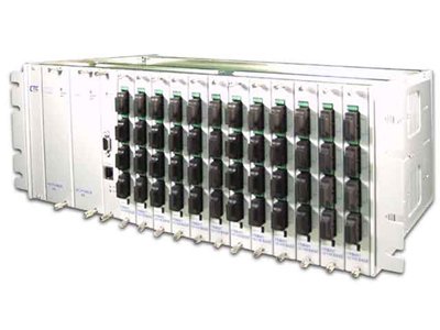 The best choice for FTTH applications, FRM401-CH chassis is supporting 12 fiber cards, each having 4 identical Fast Ethernet fiber optic media converters. It also accomodates two redundant power supplies, that could be chosen as AC(110-220V) or DC (24-48V) type. The chassis is supporting SNMP module for remote management and monitoring. FRM401 is a Copper to Fiber Media Converter chassis that fits in a 19 or 23 inch rack and occupies only 4U (7 inch) of rack space. The Hot Swappable Line Cards for the FRM401 are available in 10/100Base-TX Ethernet standard to fiber (100Base-FX) connection for multi-mode (up to 2Km) or single mode (up to 120Km) with all the popular connector types such as SC, ST, FC, or MT-RJ. Line Cards are also available with the latest WDM (Wave Division Multiplexing) technology (up to 40Km and must be coupled) which converts the transmission and receiving data streams into separate wavelengths and allows bi directional transport through a single fiber strand. Each Line Card contains four separate and identical media converters and may include optional features such as Link-loss forwarding, loop back testing, get remote status and adjustable frame length to support VLAN and QOS transmissions. A chassis, fully loaded with 12 Line Cards, can provide a total of 48 loops in a high density configuration making this chassis a perfect choice for today's high density applications like FTTH (Fiber to the Home).